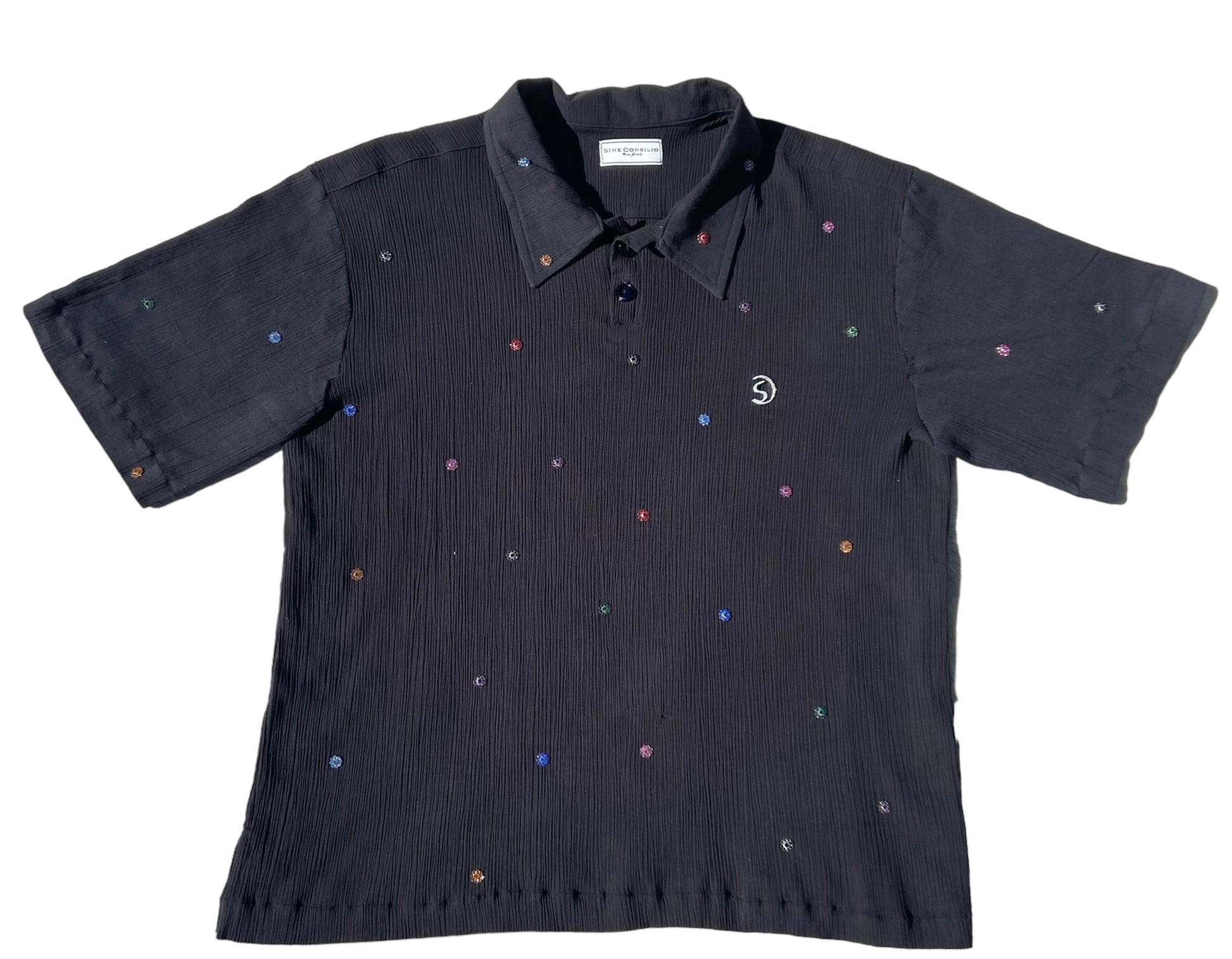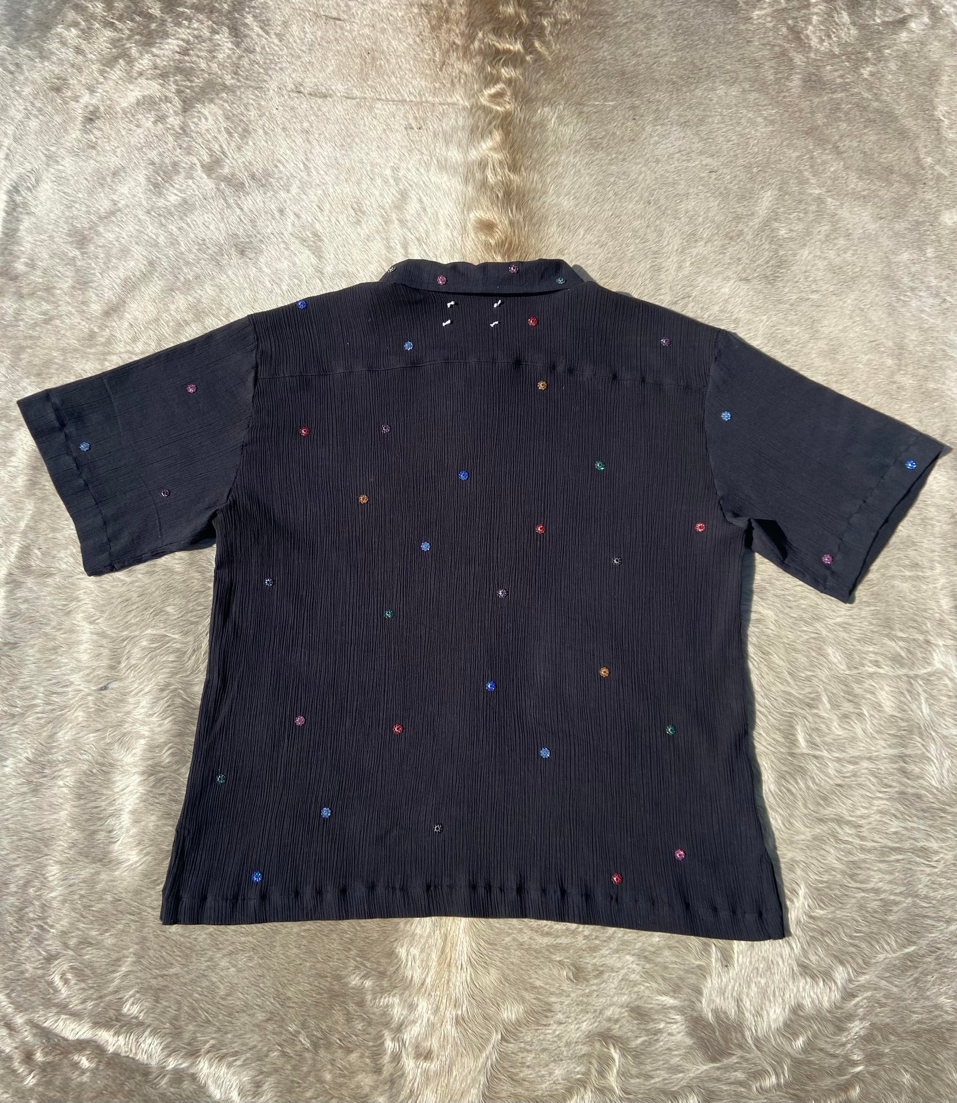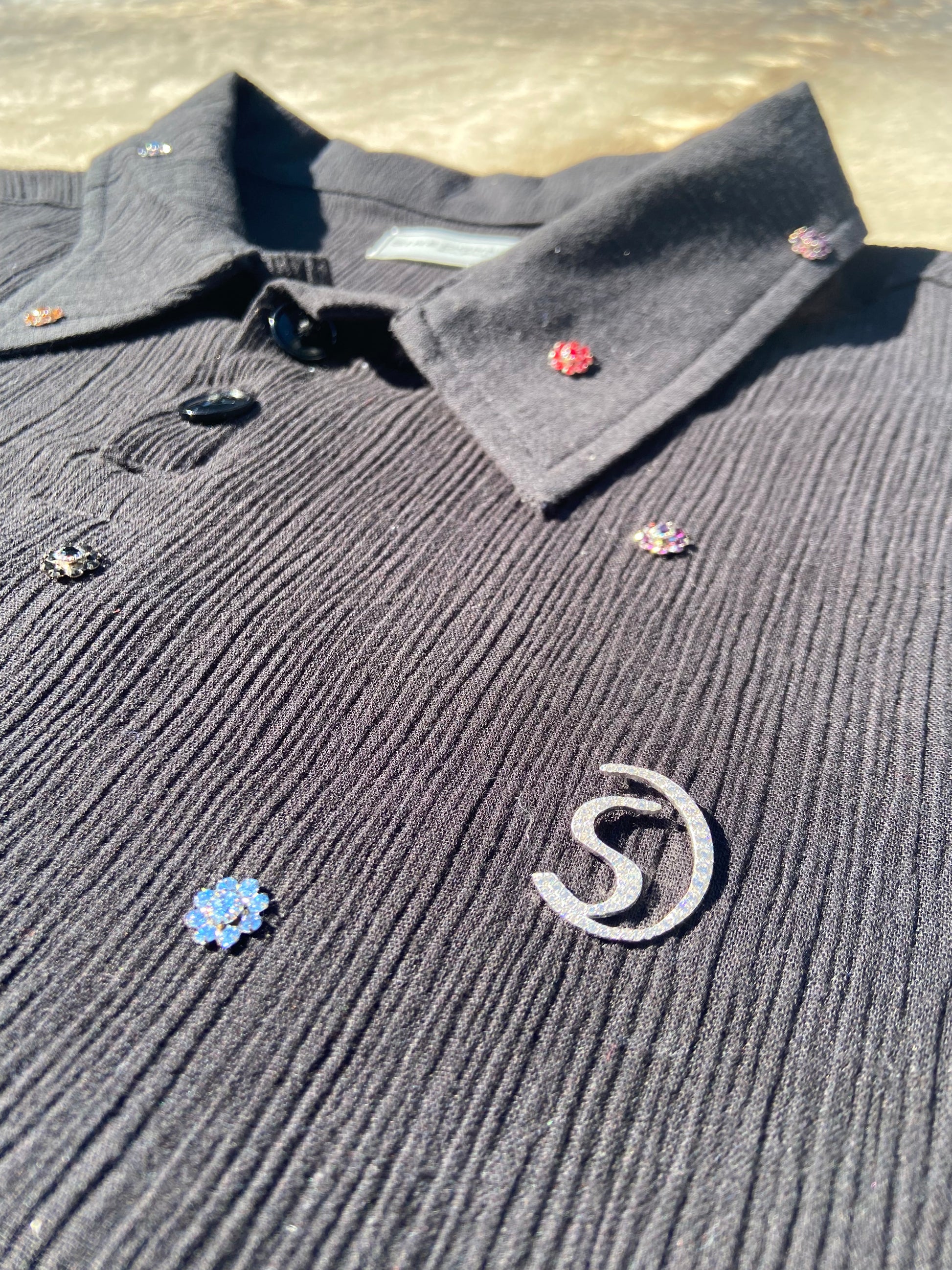 Gauze was always a familiar material to Hektor, and constant from his years as a soldier tending and wrapping injuries. When he finally found peace away from war, he used the leftover gauze to craft a shirt of his own. To give it meaning, he adorned it with jewels he'd once taken from his spoils in Austria, turning remnants of battle into something beautiful.